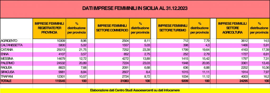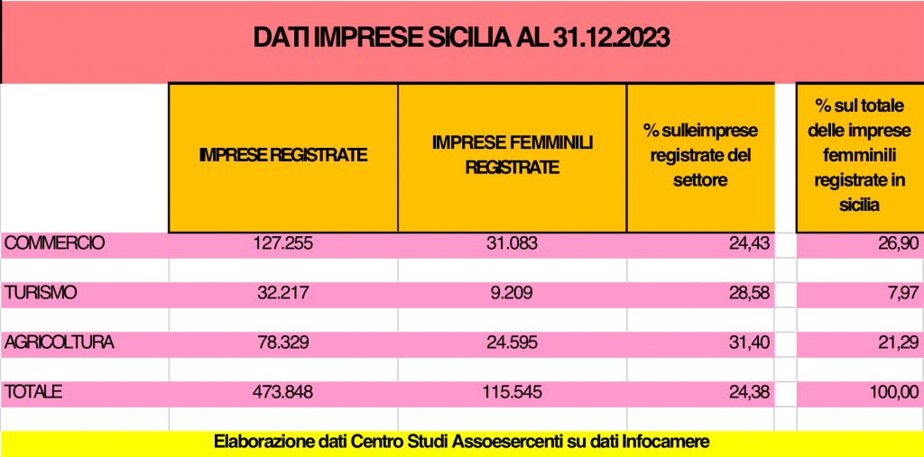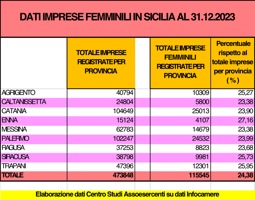 Sono oltre 115 mila le imprese femminili registrate in Sicilia a fine dicembre 2023, e rappresentano il 24,38% del totale delle imprese Siciliane registrate in Camera di Commercio, quasi 1 su 4. Il dato emerge dal rapporto sull’imprenditoria femminile realizzato dal Centro Studi di Assoesercenti analizzando i dati di Unioncamere.