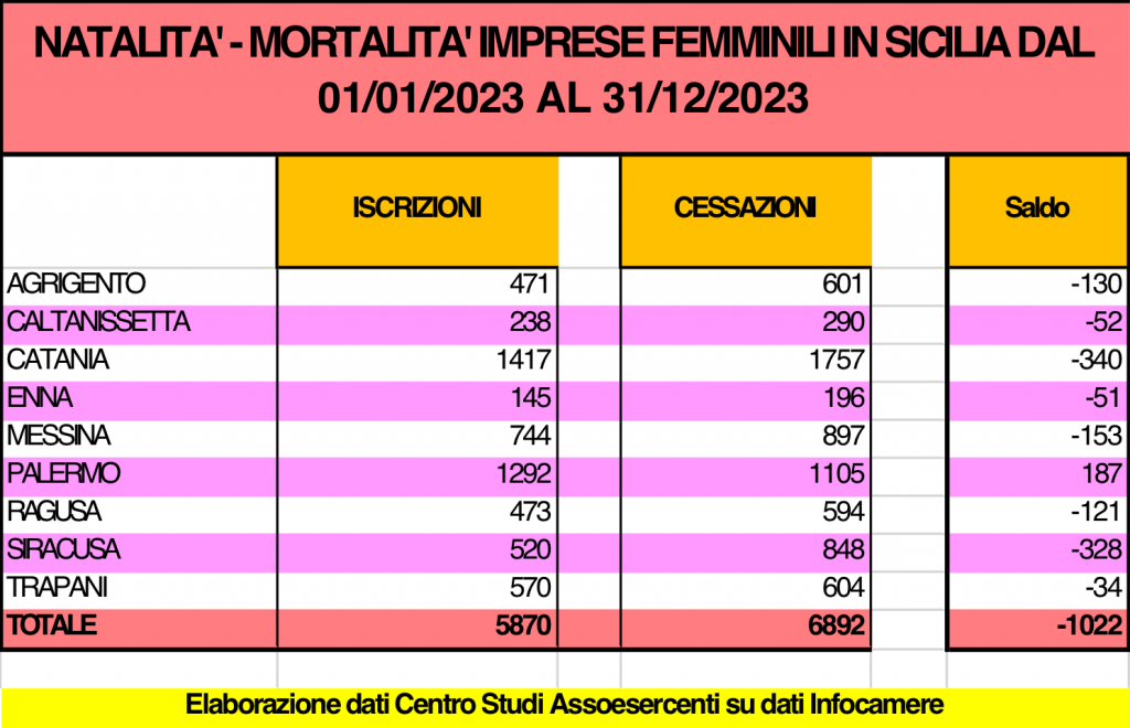 I dati natalità e mortalità delle imprese femminili in Sicilia nel 2023 mostrano un saldo negativo: per ogni 6 nuove imprese iscritte sono 7 le imprese che cessano. Sono quasi 5,9mila le nuove imprese rosa che sono nate in Sicilia nel 2023 e circa 6,9 le imprenditrici che hanno abbassato la saracinesca.
