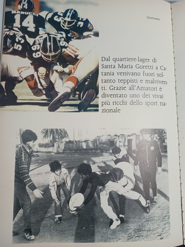 E fu così che il villaggio di Santa Maria Goretti cominciò lentamente, quasi fatalmente a diventare il vivaio più ricco del rugby catanese, un spazio prodigioso del territorio cittadini dove uno sport cominciava a diventare un autentico sistema di vita, anzi una regola per i rapporti umani, uno sfogo per l’immensa carica di violenza repressa. Sempre più spesso nelle piazze e nei vicoli di questo villaggio, nei prati e nei cortili si cominciarono a vedere ragazzini correre, affrontarsi e giocare con un pallone ovale, magari rubacchiato su qualche campo. E quasi sempre sono partite giocate con l’ accanimento e la violenza di autentiche partite. I pali, è vero, sono immaginari, ma i placcaggi sul quel fondo non certo morbido sono reali e talvolta addirittura spietati.