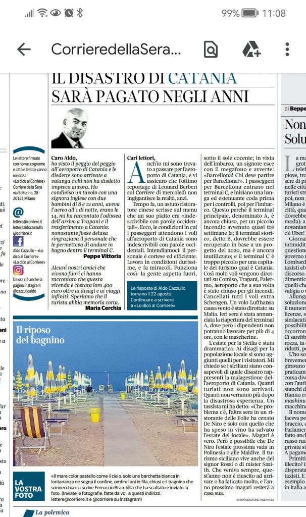 Anch’io mi sono trovato a passare per l’aeroporto di Catania, e vi assicuro che l’ottimo reportage di Leonard Berberi sul Corriere di mercoledì non ingigantisce la realtà, anzi. Tempo fa, un astuto ristoratore cinese scrisse sul menu che un suo piatto era «indescrivibile con parole occidentali». Ecco, le condizioni in cui i passeggeri attendono i voli all’aeroporto di Catania sono indescrivibili con parole occidentali. Intendiamoci: il personale è cortese ed efficiente. Lavora in condizioni durissime, e fa miracoli. Funziona così: la gente aspetta fuori, sotto il sole cocente; in vista dell’imbarco, un signore esce con il megafono e avverte: «Barcellona! Chi deve partire per Barcellona?». I passeggeri per Barcellona entrano nel terminal C, e iniziano una lunga ed estenuante coda prima per i controlli, poi per l’imbarco. Questo perché il terminal principale, denominato A, è ancora chiuso, per un piccolo incendio avvenuto quasi tre settimane fa; il terminal storico, detto B, dovrebbe essere recuperato in base a un progetto del 2020, ma è ancora inutilizzato; e il terminal C è troppo piccolo per una capitale del turismo qual è Catania. Così molti voli vengono dirottati su Comiso, Trapani, Palermo, aeroporto che a sua volta è stato chiuso per gli incendi. Cancellati tutti i voli extra Schengen. Un volo Lufthansa causa vento è stato dirottato su Malta. Ieri sera è stata annunciata la riapertura del terminal A, dove però i dipendenti non potranno lavorare per più di 4 ore, con le mascherine. L’estate per la Sicilia è stata drammatica. Ai disagi per la popolazione locale si sono aggiunti quelli per i visitatori. Mi chiedo se i siciliani siano consapevoli di quale disastro rappresenti la malagestione dell’aeroporto di Catania. Quanti turisti non sono arrivati. Quanti non verranno più dopo la disastrosa esperienza. Un tassista mi ha detto: «Che problema c’è, l’altra sera in un ristorante delle Eolie ha cenato De Niro e solo con quello che ha speso in vino ha salvato l’estate del locale». Magari è vero. Però è possibile che De Niro l’estate prossima vada in Polinesia o alle Maldive. Il turismo siciliano vive anche del signor Rossi o di mister Smith. Che veniva sempre, quest’anno non è riuscito ad arrivare o ha faticato molto, e l’anno prossimo magari resterà a casa sua.”