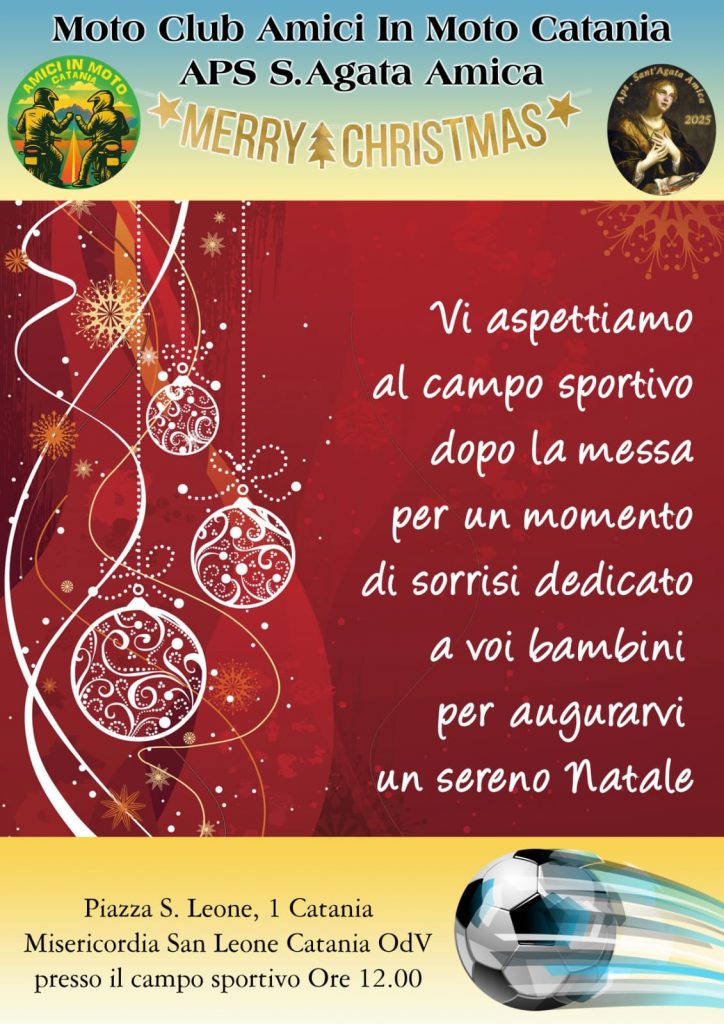 Appuntamento oggi, domenica 21 dicembre 2025, alle 12, nel quartiere di San Leone, presso il campo di calcio della Chiesa (piazza S. Leone 1) per un momento di solidarietà con i ragazzi, a cui sarà donato un panettone. Protagonista l’ associazione “Aps S.Agata Amica” assieme al “Moto Club Amici in Moto Catania”.