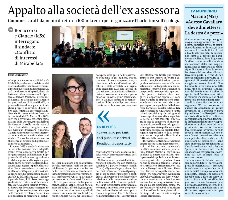 Leggiamo che l’Amministrazione avrebbe affidato, legittimamente, codice dei contratti pubblici alla mano – precisiamolo sin da subito – l’organizzazione di un evento pubblico, per una cifra che più o meno, ammonterebbe a 120 mila euro, a una società “riconducibile” a un’ex assessora, amica ed ex assistita del nostro sindaco.