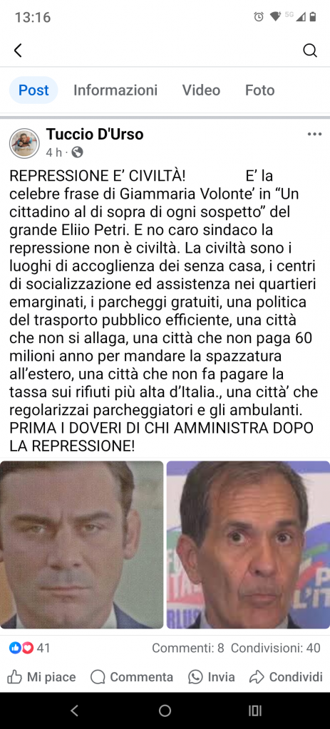 E sono – naturalmente- solo le strade del centro a fare da scenario a questi patetici video promozionali che chissà quale esperto in comunicazione suggerisce al primo cittadino di confezionare in quantità industriale per accrescere l’hype. Qualche osservatore attento constata che giammai il “dolce Enrico” (quello era altra roba e scusate per la bestemmia) ed il suo scooter fanno capolino – che so- a Monte PoMa è noto che il reuccio di palazzo Musmeci – ma residente a San Gregorio – conosce e si preoccupa dei quartieri popolari come noi abbiamo contezza di matematica attuariale e stiamo in pensiero per l’estinzione del voltolino euroasiatico.