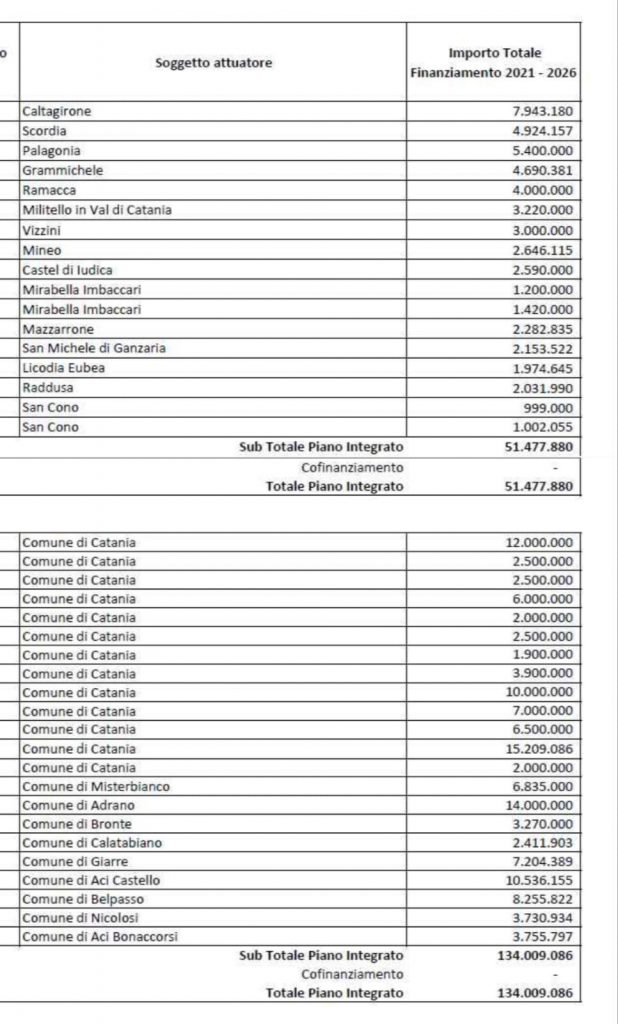 A conferma, come pubblicato su “Livesicilia”, la Cgil ha redatto un dossier che elenca tutte le somme che potrebbero essere oggetto di definanziamento del PNRR di Catania e provincia: “370milioni di euro, 26milioni nei servizi e infrastrutture, 8milioni in meno sui beni confiscati; 58milioni sull’efficienza energetica, 5milioni sulla tutela del verde, 85milioni nella riduzione dell’emarginazione sociale, e 185 milioni di euro sulla rigenerazione, appunto, dei Piani Urbani Integrati.