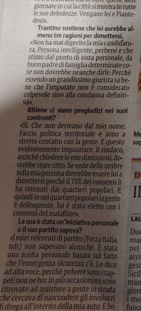 R: Sì. Che non derivano dal mio nome. Faccio politica territoriale e sono a stretto contatto con la gente. E questo evidentemente impaurisce. Il sindaco, anziché chiedere le mie dimissioni, dovrebbe stare zitto. Se vede delle ombre sulla mia persona dovrebbe essere lui a dimettersi perché il 75% dei consensi li ha ottenuti dai quartieri popolari. E quindi se nei quartieri popolari la gente è delinquente, lui è stato eletto con i consensi del malaffare…”.