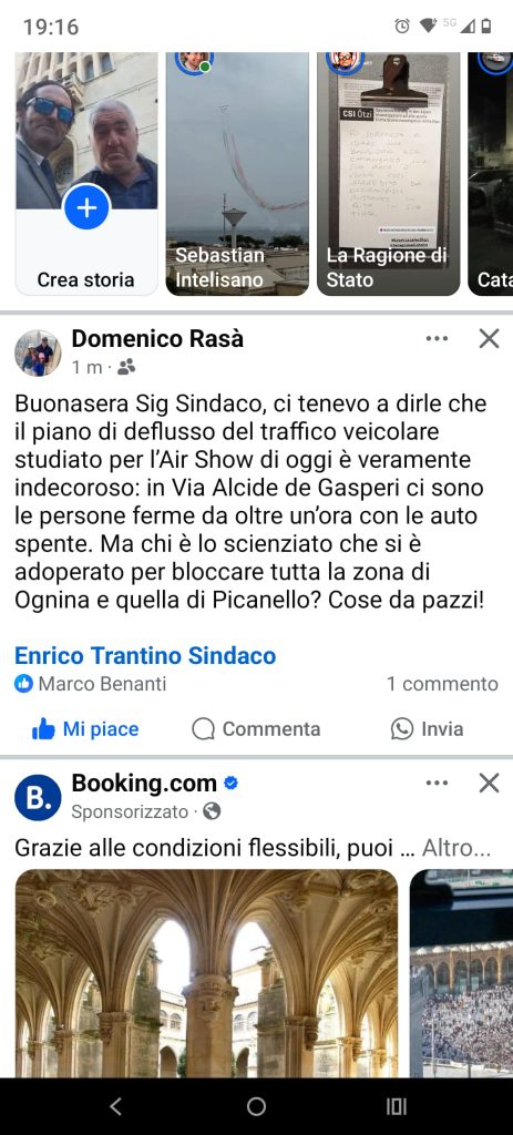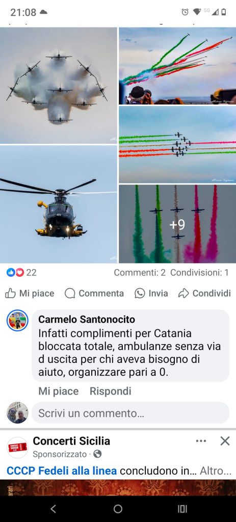 Mentre la città era nel caos automobilistico, con scene da delirio collettivo, lui era in tribuna allo stadio. Come un Pogliese qualunque. E guardava soddisfatto i “risultati” di una “giornata bestiale”, o meglio di un weekend da incubo, che lo ha visto prima in “versione scupinu” sul lungomare e poi “guida” della performance delle militarista e inquinante delle “Frecce Tricolori” >(con annesso spot dei compagni di Legambiente, che spingono -involontariamente?- per una manifestazione-show tossico).