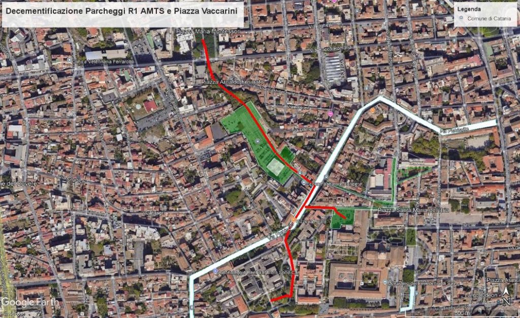 Relativamente al parcheggio R1 AMTS che vedrebbe diminuire il numero di stalli, c’è già un progetto del Comune per la sua trasformazione in parcheggio in parte interrato ed in parte fuori terra, in modo che occuperebbe solo una porzione dell’area, lasciando il resto della superficie a verde. Tale parcheggio andrebbe ad occupare l’area di sedime dell’attuale edificio centrale che andrebbe demolito/sostituito. Andrebbero altresì demoliti gli altri edifici e magazzini presenti ad eccezione di quelli destinati ad uffici. L’ingresso/uscita al Parcheggio avverrebbe sempre da via del Plebiscito così com’è attualmente, anche in quanto un ingresso/uscita da piazza Montessori non sarebbe consentito dato il vincolo di salvaguardia delle lave.